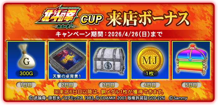 神拳勝舞の背景1110 金宝箱×1 150 ![天撃の卓背景2[卓背景]](../../img/event/competition/hokuto_tensei2_item10.jpg)