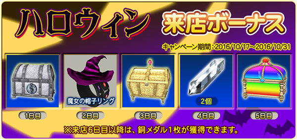 10/17より、「ハロウィン来店ボーナス」を開催します! 2日目で限定アイテム「魔女の帽子リング」がもらえる!